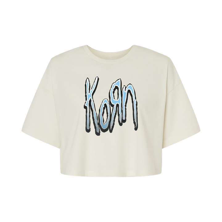 The KoRn Logo Ladies Crop T-Shirt is a retail fit, pre-shrunk, women's cropped tee featuring a KoRn logo printed on the front. Constructed from 100% airlume combed and ring-spun cotton.