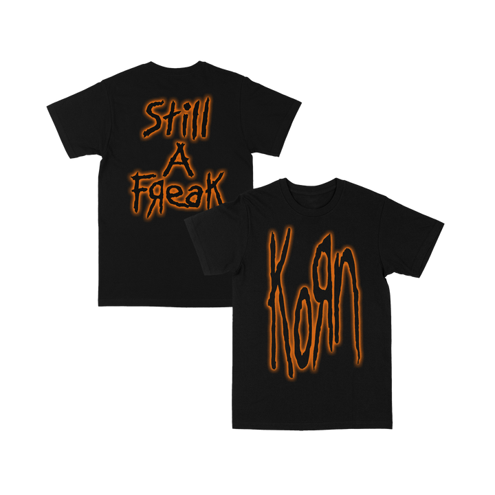 100% cotton, black t-shirt features the Korn logo on the front and "Still A Freak" design on the back. Ink is orange but glows green.