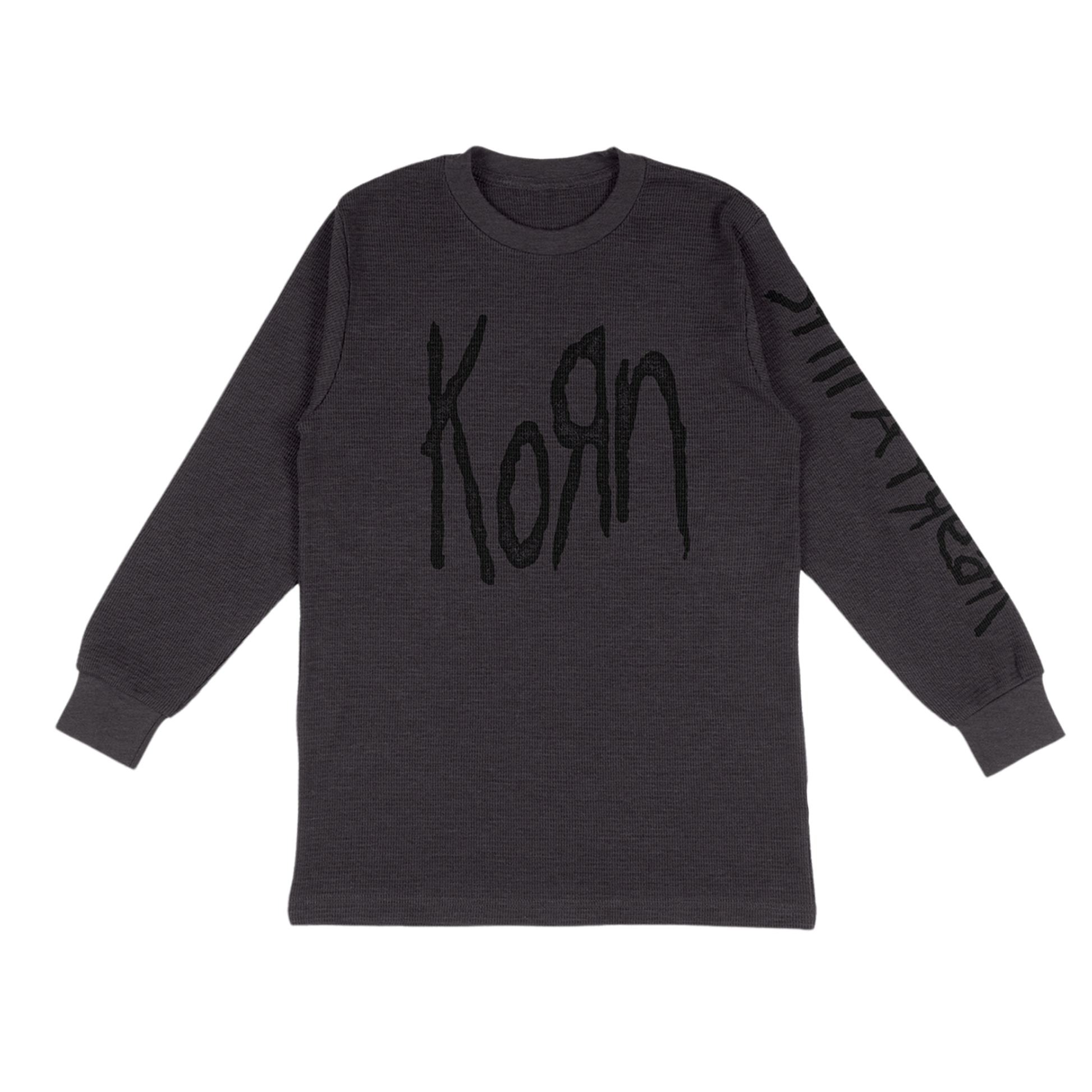 100% cotton 'vintage black' heavyweight thermal long sleeve with 'KoRn' screen-printed on front and 'Still a Freak' on sleeve.